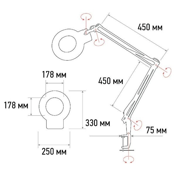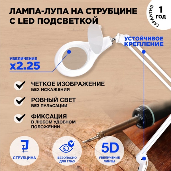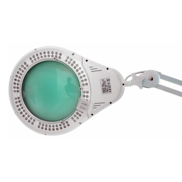 Лупа на струбцине круглая настольная 5Х с подсветкой 108 LED, белая REXANT предназначена для визуального увеличения различных мелких предметов или их фрагментов.Она используется в косметологии, в тату-салонах, при выполнении ювелирных и радиомонтажных работ, при ремонте часов, в биологии и медицине, в швейном и вышивальном деле, для организации труда людей со слабым зрением, а также для других работ, где требуется дополнительное увеличение и подсветка рабочего поля.Такая оптическая система состоит из линзы, удобного пантографического механизма и бестеневой подсветки.