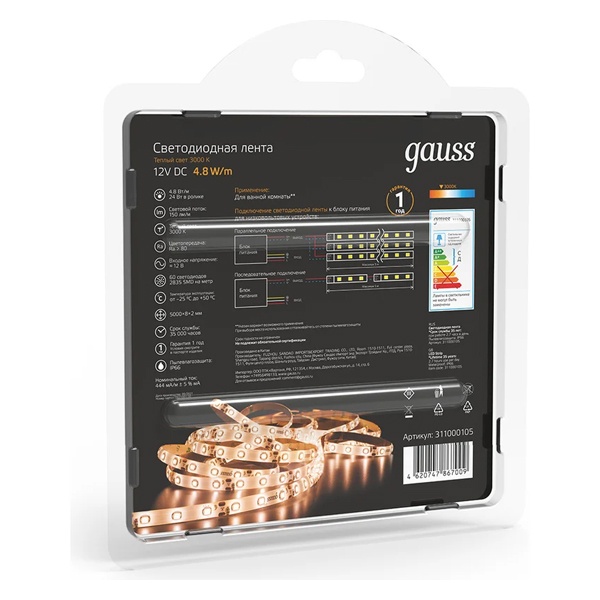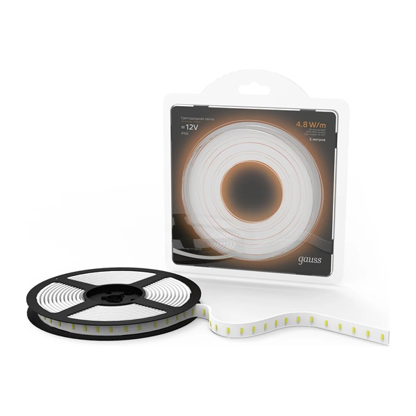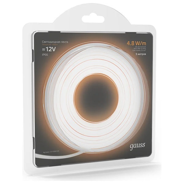 Гибкая Led лента Гаусс с повышенной защитой от влаги и пыли, 60 светодиодов мощностью 4.8 Вт на метр, теплый белый свет. 311000105