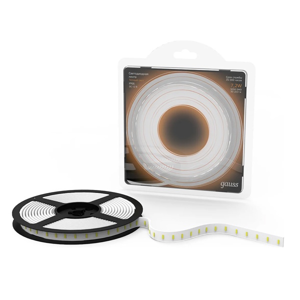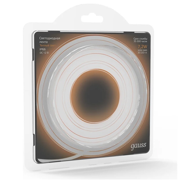 • Лента светодиодная Gauss 5050/30-SMD 7.2W/m 12V DC теплый белый IP66 (упаковка 5м)