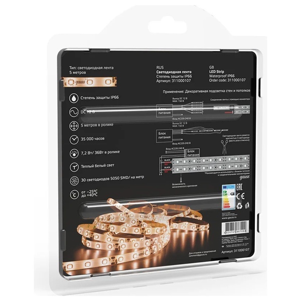 311000107 Лента светодиодная Gauss 5050/30-SMD 7.2W/m 12V DC теплый белый IP66 (упаковка 5м) фото 8
