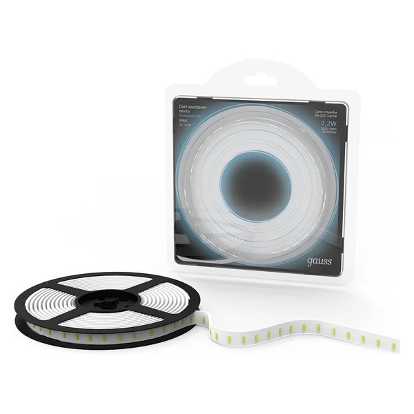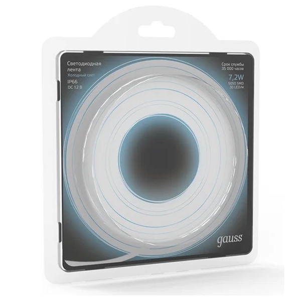• Лента светодиодная Gauss 5050/30-SMD 7.2W/m 12V DC холодный белый IP66 (упаковка 5м)