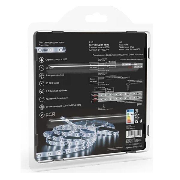 311000307 Лента светодиодная Gauss 5050/30-SMD 7.2W/m 12V DC холодный белый IP66 (упаковка 5м) фото 10