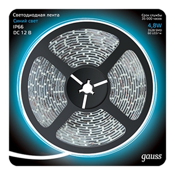 Влагозащищеннная LED лента Гаусс 12 Вольт, 60 светодиодов синего света, мощностью 4.8 Ватт на метр. 311000505
