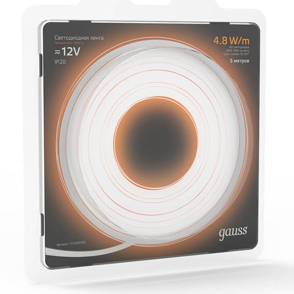 Лента светодиодная Gauss 2835/60-SMD 4.8W/m 12V DC теплый белый IP20 (упаковка 5м) 312000105
