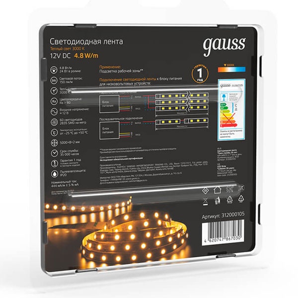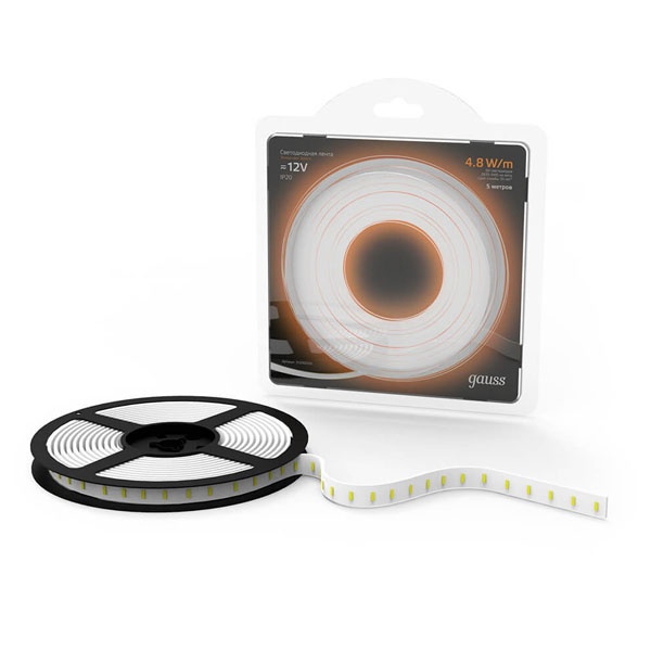 312000105 Лента светодиодная Gauss 2835/60-SMD 4.8W/m 12V DC теплый белый IP20 (упаковка 5м) фото 7