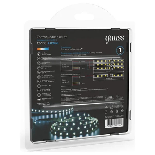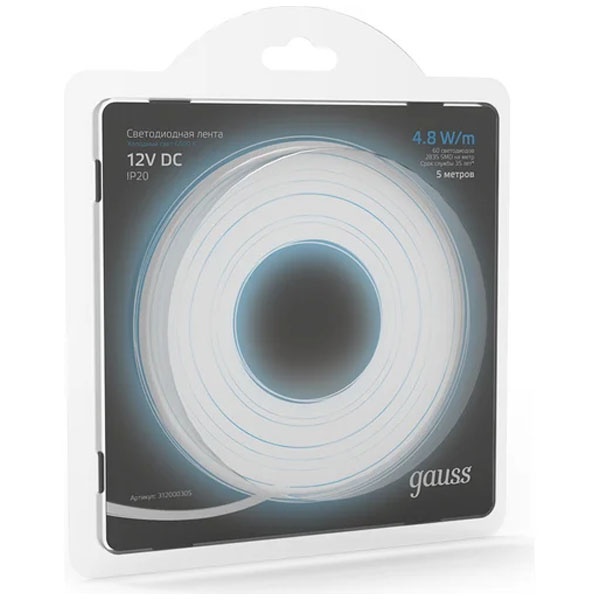 Гибкая Led лента Гаусс IP20, 60 светодиодов 12 Вольт мощностью 4.8 Вт на метр, холодный белый свет. 312000305