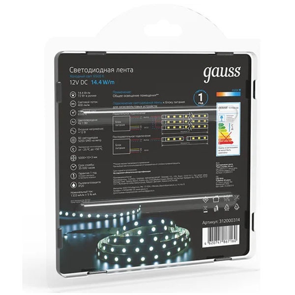 312000314 Лента светодиодная Gauss 5050/60-SMD 14.4W/m 12V DC холодный белый IP20 (упаковка 5м) фото 7