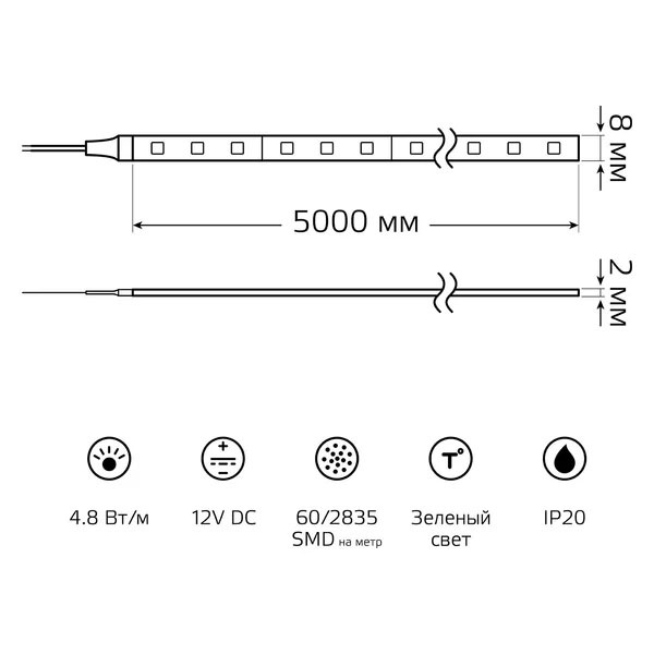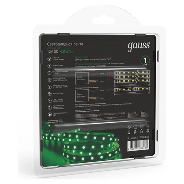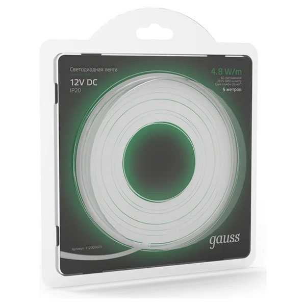 12ти вольтовая зеленая LED лента Гаусс мощностью 4.8 Вт/м, длиной 5000мм, IP20. 312000605