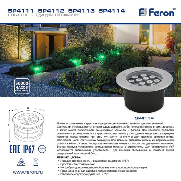 Светильник устанавливается в грунт вдоль дорожек, либо непосредственно в сами дорожки, а также может подсвечивать ландшафтные элементы и фасады. Для фасадной подсветки светильники устанавливаются в грунт непосредственно у стен здания, чаще всего в середине пролетов между окнами, при этом луч светит на стену и дает красивое световое пятно. Оптическая часть светильника защищена при помощи внешнего кольца из нержавеющей стали и каленого стекла. Корпус светильника выполнен из литого под давлением алюминия. Внутри корпуса установлена светодиодная матрица с отражателем. Для обеспечения IP67 используется силиконовый уплотнитель. Для монтажа светильника в комплект входит специальный пластиковый бокс.