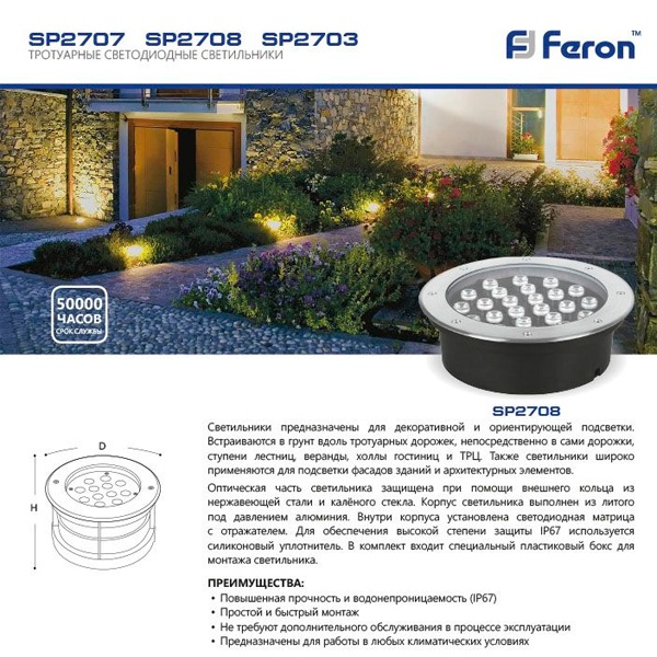 Герметичный тротуарный светодиодный светильник Ферон SP2708 мощностью 24 Вт, 6400К. 32137