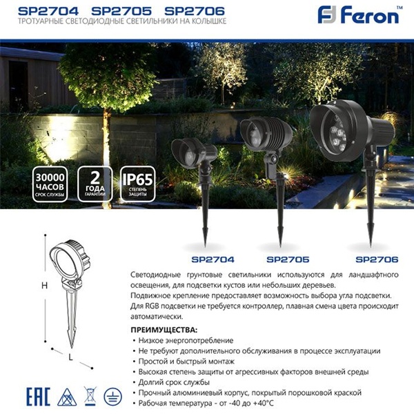 Тротуарный светильник светодиодный, на колышке (ДВУ) FERON SP2706, 12W, (зеленый), 85-265V/50Гц, IP65, угол рассеивания 24, 12LED*HPL, класс защиты 1, раб.t -40C...+40C, цвет черный, корпус алюминий, 160*160*450мм,