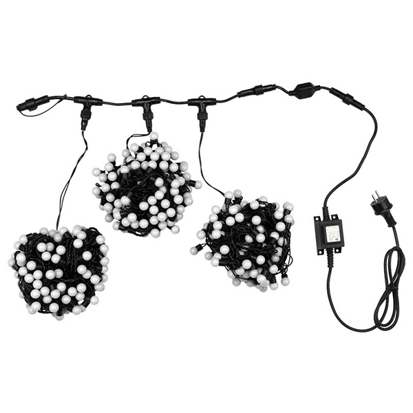 Светодиодная гирлянда «"Клип лайт" Шарики» представляет собой провод, на котором последовательно расположены светодиоды. В готовых комплектах из 3-х или 5-ти нитей длиной 20 метров источники света располагаются на расстоянии 15 см друг от друга.