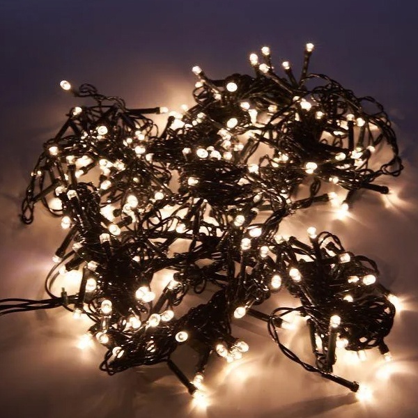 Гирлянда рассчитана на питание от сети 230V и оснащена зеленым проводом, который менее заметен на фоне хвои. Длина рабочей части 5 м дополняется подводящим шнуром 1,5 м, что облегчает подключение к розетке даже при удаленном расположении елки от точки питания.
