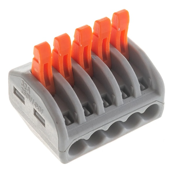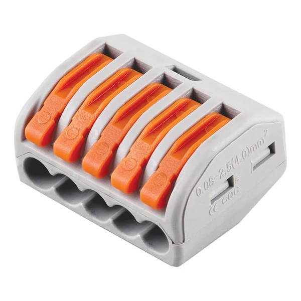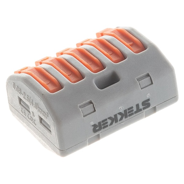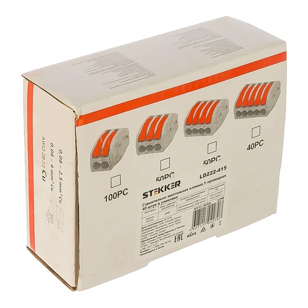 Клемма пружинная универсальная STEKKER LD222-415, 5-проводная 0,08 - 2,5/4 мм2, 400В, 24 A, 32 A, без пасты, материал изделия пластик, латунь. Тип провода одножильный/многожильный, материал провода медь, температура окружающей среды -20...+40C