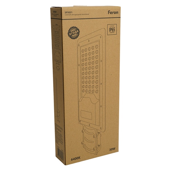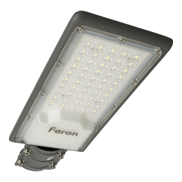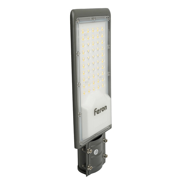 Уличный светильник консольный светодиодный, на столб (ДКУ) FERON SP3031, 30W, 6400К (холодный белый), 190-250V/50Гц, 3000Lm, IP65, угол рассеивания 120, 30LED*SMD3030, класс защиты 1, раб.t -60C - +45C, цвет серый, корпус алюминий, 355*155*57мм,
