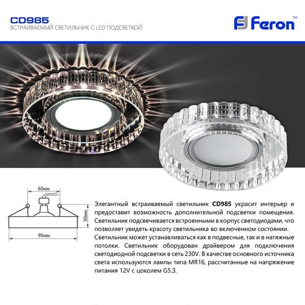 Элегантный встраиваемый светильник CD985 украсит интерьер и предоставит возможность дополнительной подсветки помещения. Светильник подсвечивается встроенными в корпус светодиодами, что позволяет увидеть фактуру и красоту светильника во включенном состоянии. Светильник может устанавливаться как в подвесные, так и в натяжные потолки. Светильник оборудован драйвером для подключения светодиодной подсветки для прямого включения в сеть 230V и в качестве основного источника света используются лампы типа MR16, рассчитанные на напряжение питания 12V с цоколем G5.3