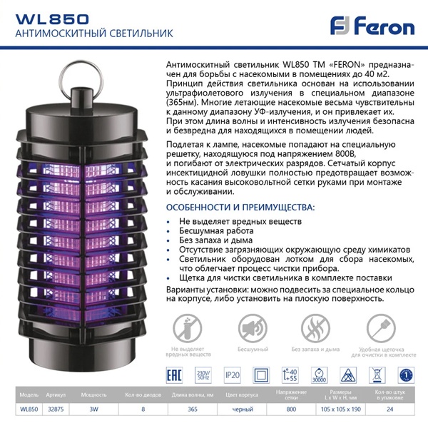 Антимоскитный светильник LB-850 используется для борьбы с насекомыми в помещениях до 40 м2