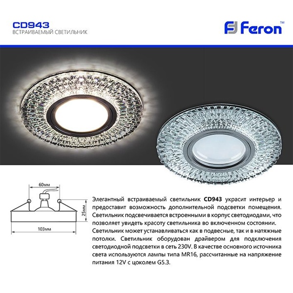 Элегантный встраиваемый светильник CD943 украсит интерьер и предоставит возможность дополнительной подсветки помещения. Светильник подсвечивается встроенными в корпус светодиодами, что позволяет увидеть красоту светильника во включенном состоянии. Светильник может устанавливаться как в подвесные, так и в натяжные потолки. Светильник оборудован драйвером для подключения светодиодной подсветки в сеть 230 В. В качестве основного источника света используются лампы типа MR16, рассчитанные на напряжение питания 12 В с цоколем G5.3.