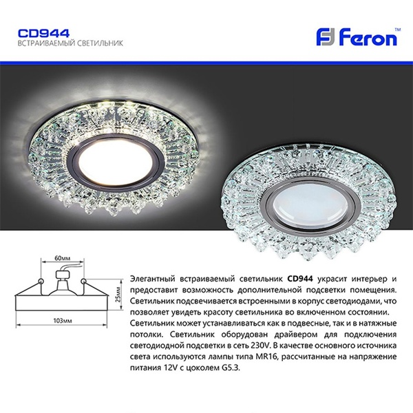 Элегантный встраиваемый светильник CD944 украсит интерьер и предоставит возможность дополнительной подсветки помещения. Светильник подсвечивается встроенными в корпус светодиодами, что позволяет увидеть красоту светильника во включенном состоянии. Светильник может устанавливаться как в подвесные, так и в натяжные потолки. Светильник оборудован драйвером для подключения светодиодной подсветки в сеть 230 В. В качестве основного источника света используются лампы типа MR16, рассчитанные на напряжение питания 12 В с цоколем G5.3.