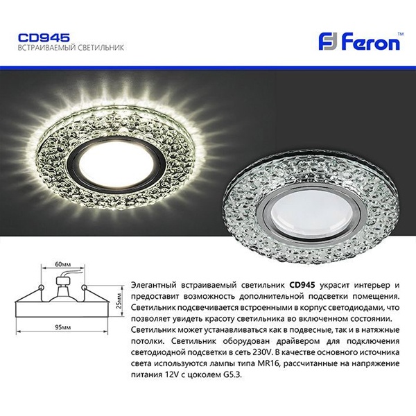 Элегантный встраиваемый светильник CD945 украсит интерьер и предоставит возможность дополнительной подсветки помещения. Светильник подсвечивается встроенными в корпус светодиодами, что позволяет увидеть красоту светильника во включенном состоянии. Светильник может устанавливаться как в подвесные, так и в натяжные потолки. Светильник оборудован драйвером для подключения светодиодной подсветки в сеть 230 В. В качестве основного источника света используются лампы типа MR16, рассчитанные на напряжение питания 12 В с цоколем G5.3.