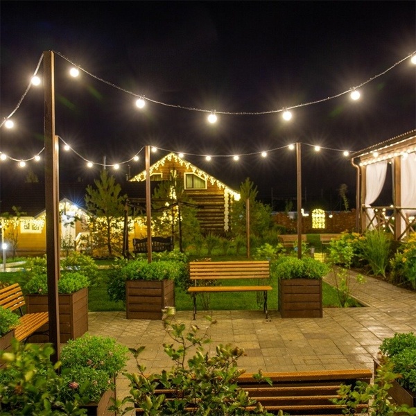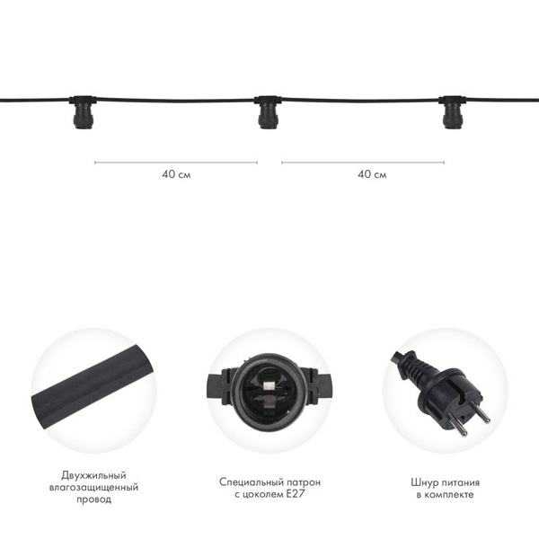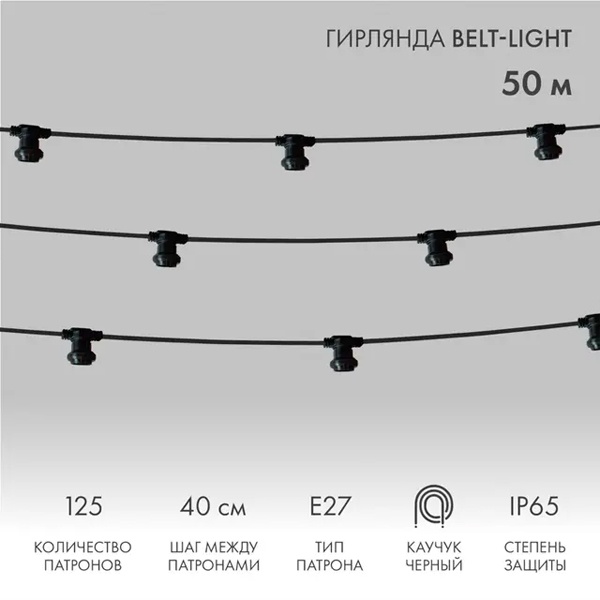 Гирлянды «Белт Лайт» могут быть двух типов – двужильные и пятижильные. Пятижильные имеют 2 модификации: для уличного применения с высоким уровнем влагозащиты и без специальной защиты для помещений. Двужильный «Белт Лайт» имеет только влагозащищенное исполнение. Для не влагозащищенного пятижильного провода Белт Лайт сделано исключение: на нем специальные патроны, имеющие цоколь E27 с «ножевыми» контактами, которые могут быть установлены в любом месте. Двужильные гирлянды имеют только режим непрерывного свечения, их подключают прямо к сети 220V. В отличие от них, пятижильные системы «Белт Лайт» питаются через контроллер. Они могут работать в светодинамическом режиме с использованием различных световых эффектов, например, «бегущий огонь».Традиционно гирлянды «Белт Лайт» оснащаются небольшими лампами накаливания. Но в настоящее время они уступают место разноцветным светодиодным лампам. На стороне последних огромные преимущества: маленькие размеры, увеличенный до 100 000 часов ресурс, хорошая влагозащищенность, широкий диапазон рабочих температур. Они обладают недосягаемой для ламп накаливания насыщенностью цветов и яркостью свечения, невысокой потребляемой мощностью (менее 5 Вт).Гирлянду можно разрезать, а фрагменты собирать в электрическую цепь и подключать через контроллер или напрямую по соответствующей схеме.Гирлянда «Белт Лайт» прекрасно подходит для декорирования любых архитектурных сооружений или для создания «перетяжек» между опорами освещения или деревьями.Данная гирлянда имеет 2 жилы. Расстояние между патронами 40 см.