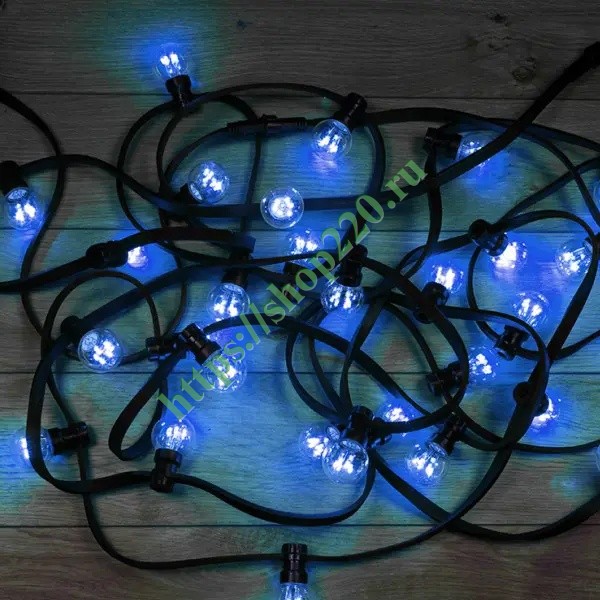 Данная гирлянда имеет длину 10 м, на которой равномерно расположено 30 лампочек синего цвета свечения.