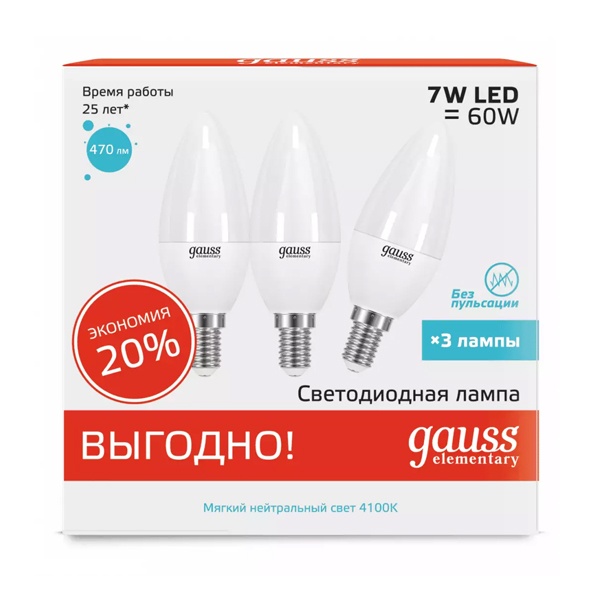 Лампа светодиодная Elementary 7Вт свеча 4100К нейтр. бел. E14 470лм промо (уп.3шт) GAUSS 33127T