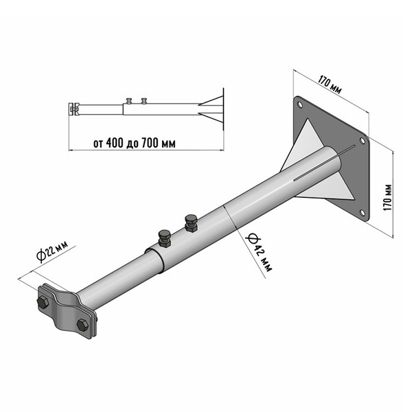 Кронштейн телескопический, применяется для установки мачты на балконы, оконные рамы, стены строений, фасады зданий и сооружения. Регулировка выноса кронштейна позволяет подобрать необходимый вылет крепления мачты к стене. Крепление мачты антенны на кронштейн поможет существенно улучшить качество принимаемого сигнала и избавит от помех вносимых различными электронными устройствами, а также стенами и крышами домов. Кронштейн изготовлен из стали, окрашенной порошковой краской, что обеспечит долговечную службу в неблагоприятных условиях окружающей среды. Изготовлен с учетом специфики Российского климата.