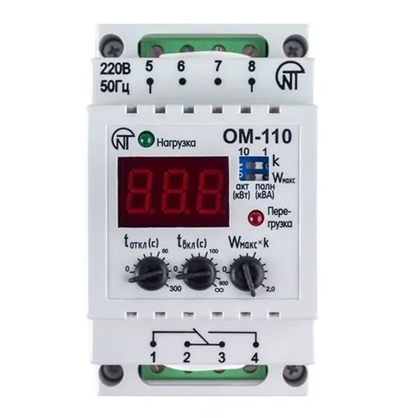 цифровой ваттметр (измеритель активной или полной мощности)реле ограничения потребляемой мощностиВ ОМ-110 для измерения тока используется встроенный трасформатор тока. ОМ-110 позволяет контролировать значение мощности и состояние нагрузки с помощью светодиодных индикаторов расположенных на лицевой панели.