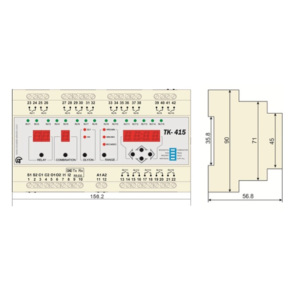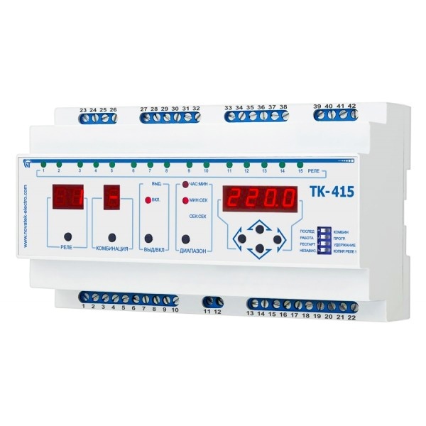 Последовательно-комбинационный таймер ТК-415 представляет собой микропроцессорное программируемое устройство и предназначено для коммутации в предварительно настроенные моменты времени 15 нагрузок по очереди (последовательный режим) или в определенных комбинациях (комбинационный режим).