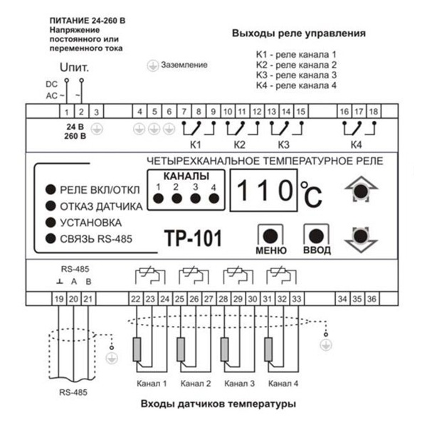 ТР-101 имеет универсальное питание и может использовать любое напряжение от 24 до 260 В, независимо от полярности.