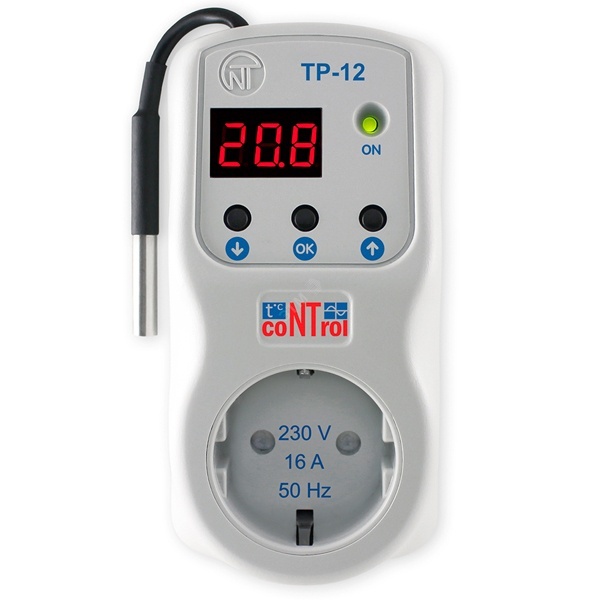 Терморегулятор Новатек в розетку ТР-12-2 16А -10…+90 °C – это удобное и надежное устройство для автоматического управления электрическим обогревом и охлаждением. Он подключается напрямую в стандартную розетку, а к нему – нагрузка (обогреватель, котел, тепловентилятор, холодильное оборудование и т.п.). Встроенный электронный блок управления и выносной датчик температуры длиной 1,8 м обеспечивают точный контроль температуры в широком диапазоне от -10 до +90 °C.
