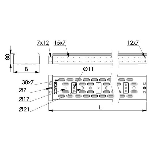 Перфорированные листовые лотки ДКС применяются для прокладки кабеля как в помещении, так и на открытом воздухе. Лотки отличаются высокой несущей способностью – подформовка, производимая при производстве этой продукции, создает дополнительное ребро жесткости, что увеличивает несущую способность системы до 54%. Перфорация сокращает вес конструкции. В лотках имеются отверстия для отвода кабеля диаметром 11 мм, 17 мм, 21 мм. Степень пыле- и влагозащиты перфорированных лотков – IP 10 при использовании крышек, входящих в состав системы. Метод соединения "мама-папа" применяемый для системы, существенно сокращает время монтажа и создает непрерывный контур. Конструктив листовых лотков ДКС предупреждает повреждение кабеля при прокладке. Толщина стали – 0,7 мм, высота лотка – 80 мм, ширина – 100 мм, длина – 3000 мм. Полезное сечение – 7800 мм. Исполнение – "сталь, оцинкованная по методу Сендзимира".