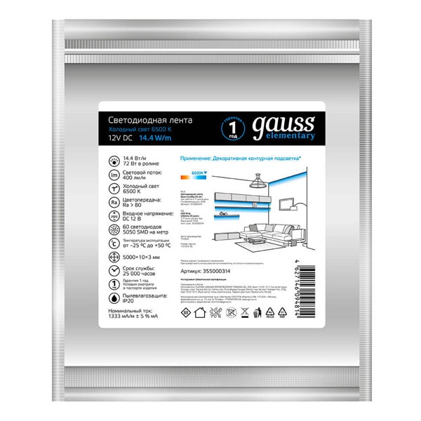 355000314 Лента светодиодная Gauss Elementary 5050/60-SMD 14.4W/m 12V DC IP20 холодный белый (упаковка 5м) фото 6