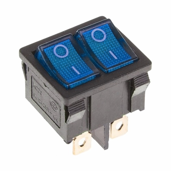 Миниатюрный клавишный выключатель Mini от компании Rexant представляет собой устройство с двумя механизмами с синими клавишами и подсветкой, которое предназначено для коммутации электрических цепей переменного тока напряжением до 250 Вольт. Оно позволяет управлять двумя независимыми линиями, что в некоторых случаях просто необходимо, и применяется в качестве комплектующего изделия различного электрооборудования. Данная модель имеет 2 положения с фиксацией каждого механизма: On-Off. Номинальный ток, на который она рассчитана, составляет 6 Ампер. Контактное сопротивление имеет не более 35 мОм. Количество контактных групп – 2, количество контактов в контактной группе – 3. Подключение контактов осуществляется плоской клеммой 6.6 мм, либо с помощью пайки. Принцип действия выключателя основан на перемещении клавиши в одну из позиций. Его монтаж производится простым защелкиванием на плоских панелях толщиной от 0.8 до 3 мм. Механическая износостойкость переключателя составляет 10 000 циклов. Рабочая температура эксплуатации находится в диапазоне от -25 до +85 градусов Цельсия.