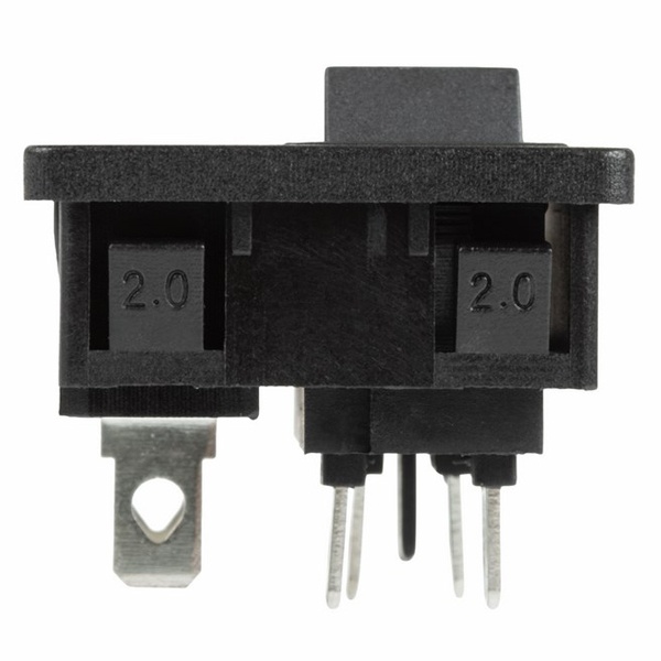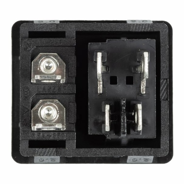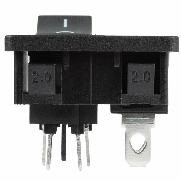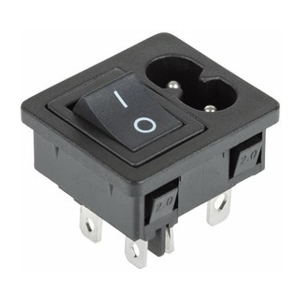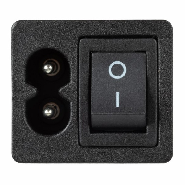Черный выключатель с клавишей и встроенным штекером торговой марки Rexant представляет собой компактное устройство, которое предназначено для коммутации электрических цепей переменного тока напряжением до 250 Вольт. Оно применяется в качестве комплектующего изделия в сетевых фильтрах и блоках питания и позволяет управлять одной двухполюсной линией. Штекер на 2 контакта относится к серии C8 и служит для подключения различных устройств. Клавишный выключатель имеет 2 положения с последующей фиксацией: On/Off. Принцип его действия основан на замыкании и размыкании контактов клавишей. При этом клавиша устройства не имеет световой индикации положения. Нагрузка тока для данной модели составляет 6 Ампер. Монтаж осуществляется простым защелкиванием на плоских панелях толщиной 2 мм. Количество контактных групп – 2, количество контактов в контактной группе – 2. Подключение контактов осуществляется плоской клеммой на 6.6 мм, либо с помощью пайки. Механическая износостойкость переключателя составляет 10 000 циклов. Рабочая температура эксплуатации находится в диапазоне от -25 до +85 градусов Цельсия.