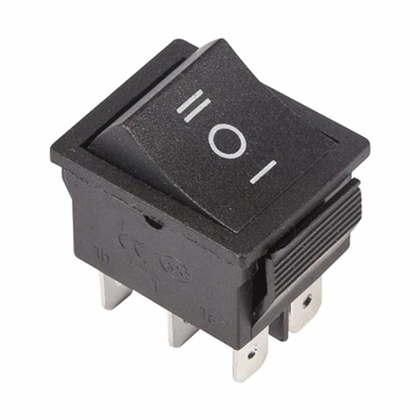 Двухполюсный выключатель от компании Rexant представляет собой компактный клавишный выключатель на три фиксируемых положения с нейтралью: On/Off/On. С помощью него осуществляется коммутация двухполюсной линии в электрической цепи переменного тока с напряжением до 250 Вольт. Выключатель применяется в качестве комплектующего изделия различного электрооборудования в быту и на производстве, например, в сетевых фильтрах и удлинителях, блоках питания и т.п. Эта модель сделана из пластика в черном цвете и имеет клавишу прямоугольной формы. При этом световая индикация коммутационного положения отсутствует. Номинальная нагрузка тока для устройства составляет 15 Ампер. Его монтаж производится простым защелкиванием без применения винтов на плоских панелях толщиной от 0.8 до 3 мм. Количество контактных групп – 2, количество контактов в контактной группе – 3. Подключение контактов осуществляется плоской клеммой 6.6 мм, либо с помощью пайки. Механическая износостойкость переключателя составляет 10 000 циклов. Рабочая температура эксплуатации находится в диапазоне от -25 до +85 градусов Цельсия. Изделие поставляется в индивидуальном прозрачном пакете.