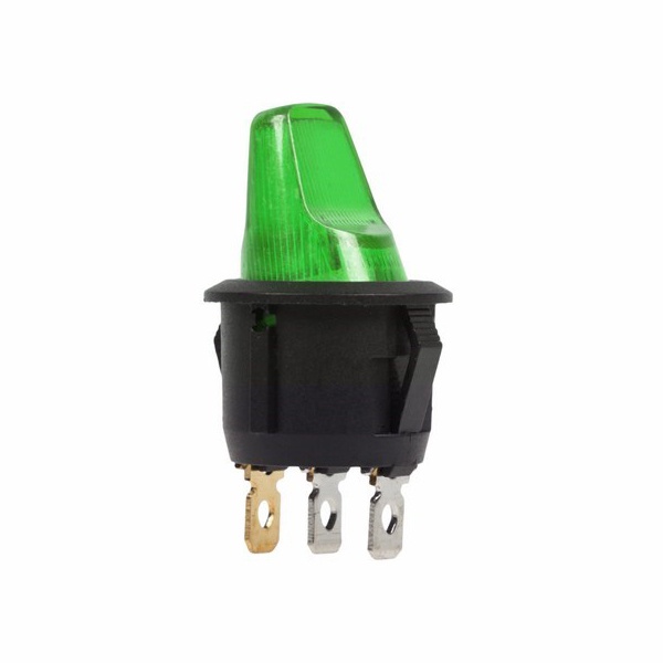 Круглый клавишный выключатель от компании Rexant представляет собой устройство со специфической формой переключателя в виде зеленой клавиши-тумблера и подсветкой, которое предназначено для коммутации электрических цепей напряжением до 12 Вольт. Оно применяется в качестве комплектующего изделия различного электрооборудования, блоков питания, устройств освещения и т.п. Данный клавишный переключатель имеет два положения с последующей фиксацией: On-Off. Принцип его действия основан на замыкании и размыкании контактов клавишей. Номинальный ток, на который рассчитан прибор, составляет 16 Ампер. Контактное сопротивление имеет не более 35 мОм. Его монтаж осуществляется без применения винтов на плоских панелях толщиной от 0.8 до 3 мм. Количество контактных групп – 1, количество контактов в контактной группе – 3. Подключение контактов осуществляется плоской клеммой 6.6 мм, либо с помощью пайки. Механическая износостойкость переключателя составляет 10 000 циклов. Рабочая температура эксплуатации находится в диапазоне от -25 до +85 градусов Цельсия.