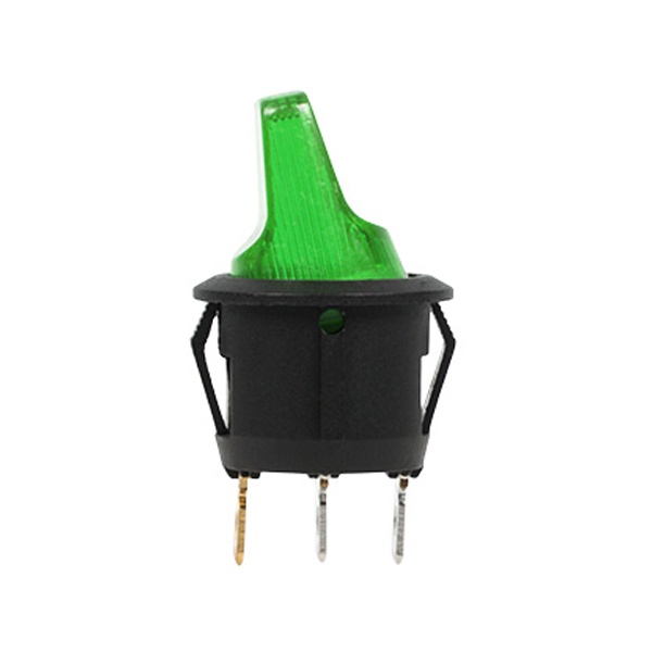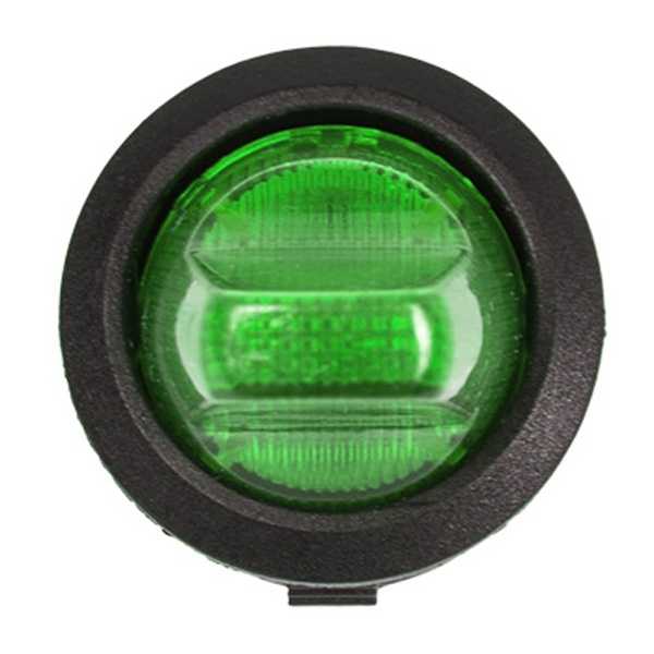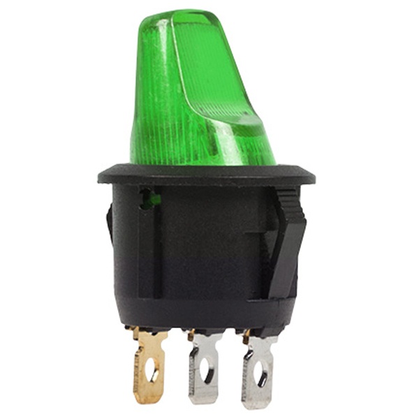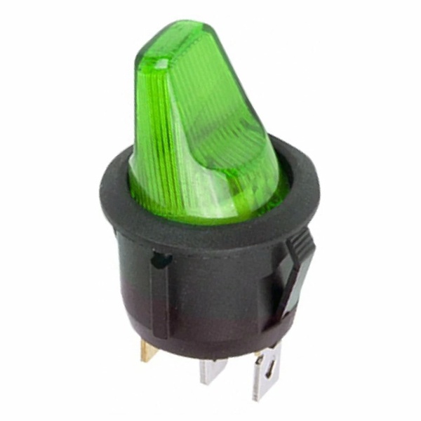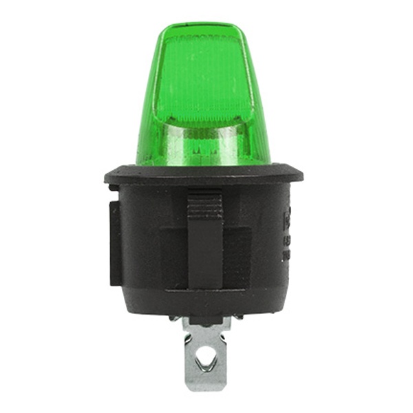 Зеленый тумблерный выключатель Рексант круглой формы на 2 положенияс индикацией для электрооборудования, 3 контакта на 6 Ампер 36-2603