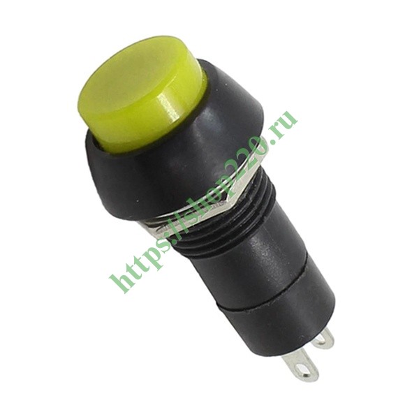 Выключатель-кнопка – это простейший коммутационный прибор, который предназначен для управления электрическими цепями переменного тока с напряжением до 250 Вольт. Данная модель на 2 положения с фиксацией (On/Off) работает по принципу замыкания контактов нажатием кнопки и размыкания их повторным нажатием. Такой выключатель торговой марки Rexant применяется в качестве комплектующего изделия различного электрооборудования: в аудиосистемах, блоках питания, устройствах освещения и других бытовых приборах. Внешне изделие состоит из двух основных частей: лицевой и контактной, и имеет пружинный возвратный механизм. Оно обладает круглой формой исполнения и оснащено желтой кнопкой. Диаметр для установки составляет 12 мм. Монтаж устройства осуществляется на плоских панелях толщиной от 0.5 до 3 мм, с помощью гайки. Подключение проводников производится путем пайки. Количество контактов – 2, количество контактных групп – 1. Номинальная нагрузка тока для этой модели составляет 1 Ампер. Рабочий ресурс достигает 10 000 циклов. Рабочая температура эксплуатации находится в диапазоне от -25 до +85 градусов Цельсия.