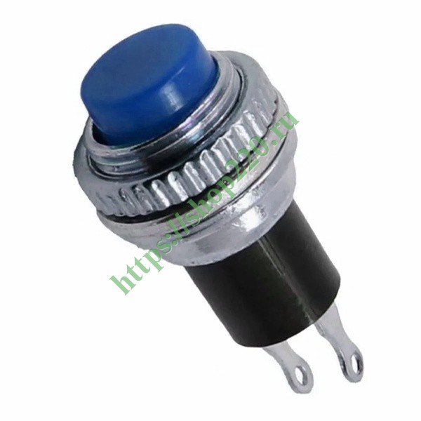 Кнопочный выключатель Mini торгового знака Rexant представляет собой компактный круглый элемент управления, который широко используется в быту и на производстве и предназначен для коммутации электрических цепей переменного тока напряжением до 220 Вольт. Принцип его действия состоит в замыкании контактов питающего провода при нажатии на кнопку. Данная модель используется в качестве комплектующего изделия для различных приборов и имеет 2 положения без фиксации: (On)/Off. Это означает, что устройство имеет ручное управление и работает только при непрерывном удержании кнопки. Такой тип выключателей используется и для подачи команды импульсом напряжения. Внешне изделие оснащено синей кнопкой и заключено в металлический корпус, чем гарантирует прочность и надежность при эксплуатации. Его механическая износостойкость составляет 10 000 циклов. Номинальный ток для модели не превышает 2 Ампера. Установочный диаметр достигает 10.2 мм, высота наружной части – 8.2 мм. Монтаж производится гайкой на плоских панелях толщиной от 0.5 до 3 мм. Количество контактных групп – 1, количество контактов в контактной группе – 2. Подключение проводников производится путем пайки. Рабочая температура эксплуатации находится в диапазоне от -25 до +85 градусов Цельсия.