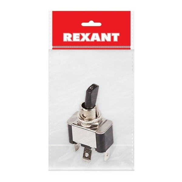 Устройство переключения от компании Rexant предназначено для коммутации электрических цепей напряжением 12 Вольт. Номинальная нагрузка тока для переключателя составляет 30 Ампер. Он представляет собой тумблер на 2 положения с фиксацией: On-Off и индикацией коммутационных положений в виде светодиодной подсветки красного цвета. Количество контактных групп – 1, количество контактов в контактной группе – 3. Подключение контактов осуществляется с помощью плоских клемм, либо с помощью пайки. Монтаж устройства осуществляется без применения винтов на плоских панелях толщиной от 0,8 до 4 мм. Установочный диаметр – 12,2 мм. Переключатель применяется в качестве комплектующего изделия различного электрооборудования, например, в измерительных приборах, блоках питания, электроустановках на различных производствах. Ручка-переключатель этой модели выполнена из черного пластика, цвет пластикового корпуса – хром и черный. Рабочий ресурс устройства равен 10 000 циклов. Диапазон рабочих температур достигает от -25 до +85 градусов.