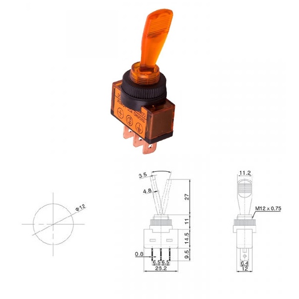 Миниатюрный выключатель с желтой подсветкой производителя Rexant представляет собой однополюсный тумблер с одной контактной группой с 3 контактами для коммутации электрических цепей напряжением 12 Вольт. В устройстве предусмотрено 2 положения: On-Off с фиксацией и световая индикация. Нагрузка тока для этого устройства составляет 20 Ампер. Переключатель применяется на лицевых панелях в качестве комплектующих изделий различного электрооборудования. Монтаж осуществляется без применения винтов на плоских панелях толщиной от 0,8 до 4 мм, диаметр установочного отверстия – 12,2 мм. С помощью удлиненного пластмассового перекидного рычага длиной 27 мм осуществляется замыкание и размыкание электрической цепи. Для переключения в нужное положение требуется приложить некоторые усилия. Подключение к контактам осуществляется с помощью плоских клемм, либо с помощью пайки. Данная модель изготовлена из прозрачного желтого пластика и металлических монтажных элементов. Рабочий ресурс изделия равен 10 000 циклов. Диапазон рабочих температур переключателя составляет от -25 до +85 градусов Цельсия.