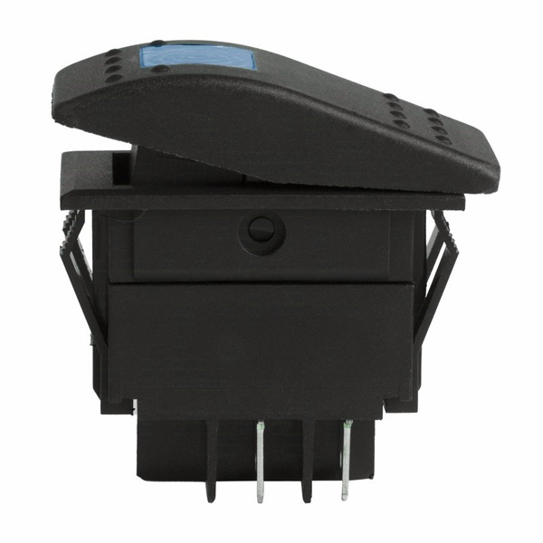 Устройство коммутации от компании Rexant представляет собой компактный клавишный выключатель на 2 положения с фиксацией: On/Off. С помощью него осуществляется коммутация одной двухполюсной линии в электрической цепи постоянного тока напряжением до 12 Вольт. Выключатель применяется в качестве комплектующего изделия различного электрооборудования в быту и на производстве, например, в блоках питания, устройствах освещения и т.п. Эта модель прямоугольной формы сделана из пластика в черном цвете и имеет световую индикацию синего цвета, которая обеспечивает наглядность за работой устройства. Номинальная нагрузка тока для модели составляет 35 Ампер. Монтаж производится простым защелкиванием без применения винтов на плоских панелях толщиной от 0.8 до 3 мм. Количество контактных групп – 2, количество контактов в контактной группе – 2. Подключение контактов осуществляется плоской клеммой 6.6 мм, либо с помощью пайки. Механическая износостойкость переключателя составляет 10 000 циклов. Рабочая температура эксплуатации находится в диапазоне от -25 до +85 градусов Цельсия.