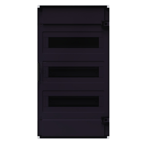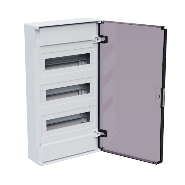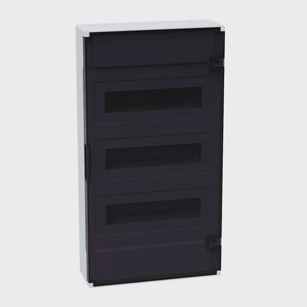 Пластиковый трехрядный распределительный шкаф на 36 модулей накладной установки с тонированной дверью 379803
