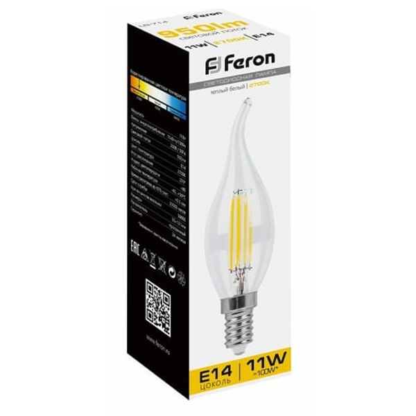 Лампа светодиодная филамент FERON LB-714, C35T (свеча на ветру), 11W 230V E14 2700К (белый теплый), рассеиватель прозрачный 950Lm, угол рассеивания 270, 121*35мм