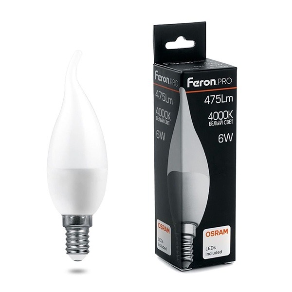 Лампа светодиодная FERON LB-1306, C37T (свеча на ветру), 6W 230V E14 4000К (белый), рассеиватель матовый белый, 475Lm, угол рассеивания 200, 124*37мм