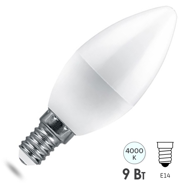 Лампа светодиодная FERON LB-1309, C37 (свеча), 9W 230V E14 4000К (белый), рассеиватель матовый белый, 760Lm, угол рассеивания 200, 114*37мм