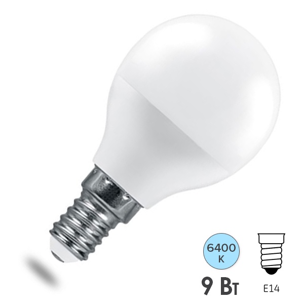 Лампа светодиодная FERON LB-1409, G45 (шар), 9W 230V E14 6400К (дневной), рассеиватель матовый белый, 790Lm, угол рассеивания 220, 92*45мм