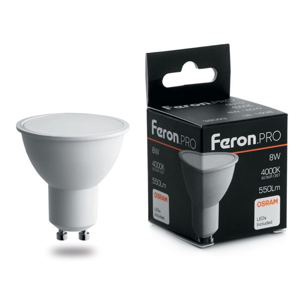 Лампа светодиодная FERON LB-1608, MR16 (рефлекторная), 8W 230V G5.3 2700К (белый теплый), рассеиватель матовый белый, 530Lm, угол рассеивания 120, 52*50мм